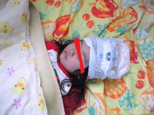 ふざけてオムツをかぶって遊んでいたら間もなく居眠りしてしまったようで、おもしろいから取らずに布団に移動させたようです♪