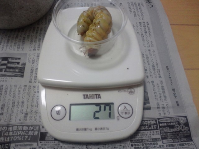 すでに2本目経過している状態の幼虫です。30グラムには届きませんがそこそこな大きさで羽化してくれることを願っています♪