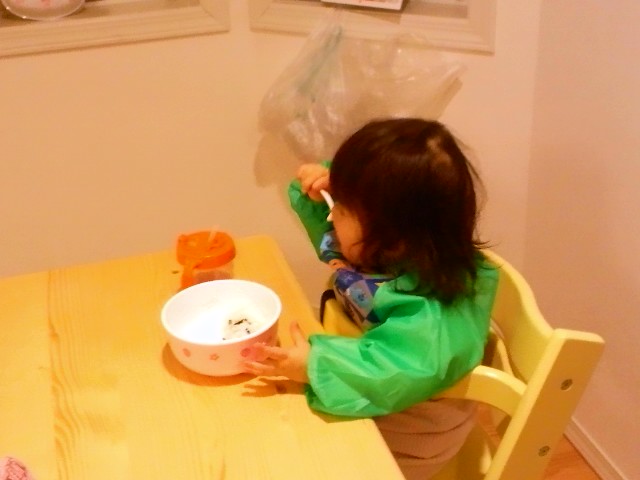 床にはかなり散らかしながらも、自分でやってくれれば大人の食事もラクちんになるというものです(^_^;)