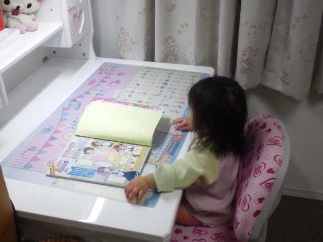 ↓ そして今度はお姉ちゃんが小学校入学祝いとして買ってもらった学習デスクに座りたがりました!
