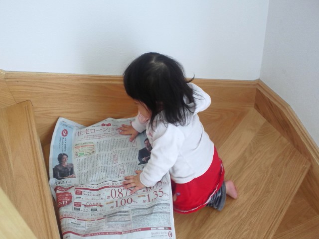 階段のところに新聞紙を持って行って意味もわからずに閲覧してるフリ。。
