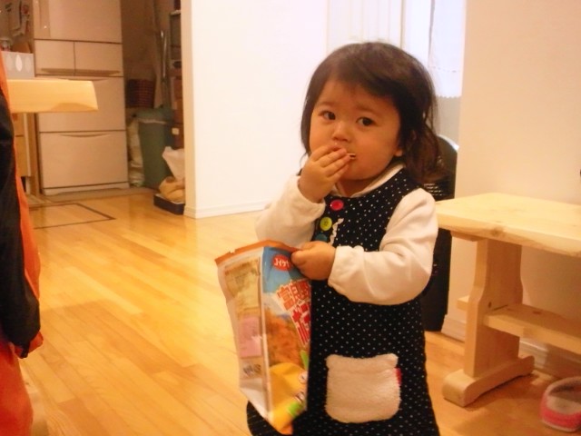やはり!!お菓子の袋を手に持ってモグモグ・・・そのお菓子は長女が食べかけていたもので、袋を軽く閉じてキッチンのシンクのあたりに置いてあったんです。