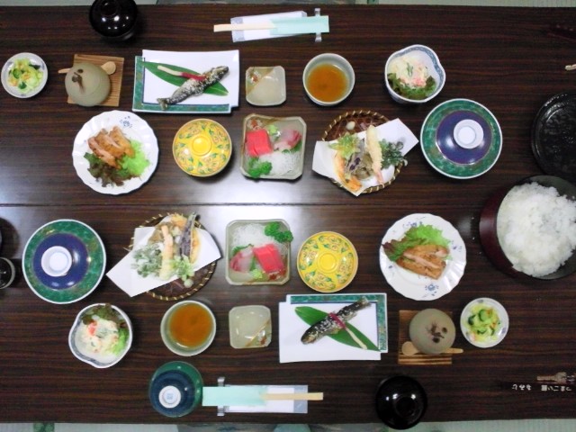 そしてこちらが、旅館の夕食です。ただしプライベートでの宿泊契約ではないので料理のグレード的なものはわかりません・・・
