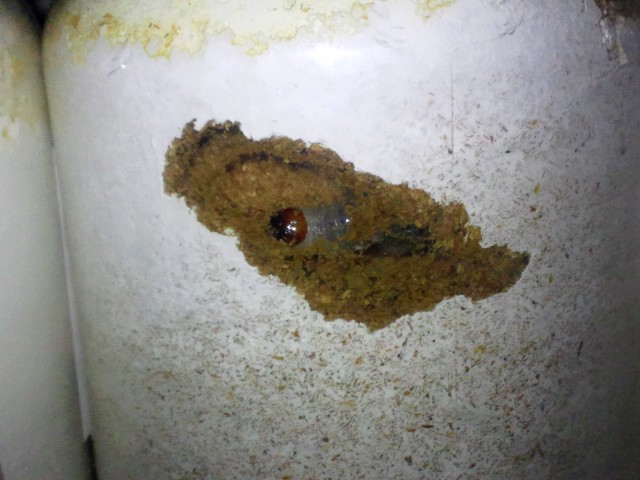 こんばんは!食痕がまったく見えてなかったウッディ幼虫のボトルに、嬉しいことに食痕がいつのまにか!そしてそこには幼虫の姿が見えました^^