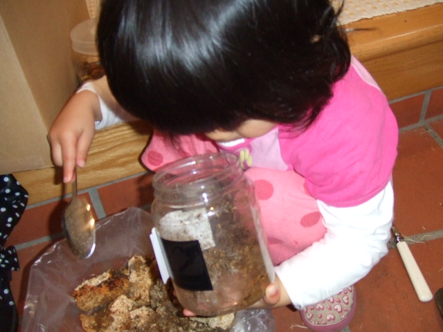 ↓ さすがにウッディ幼虫をいじらせるのはこわいので、幼虫を取り出した後の作業をやらせておきます ♪