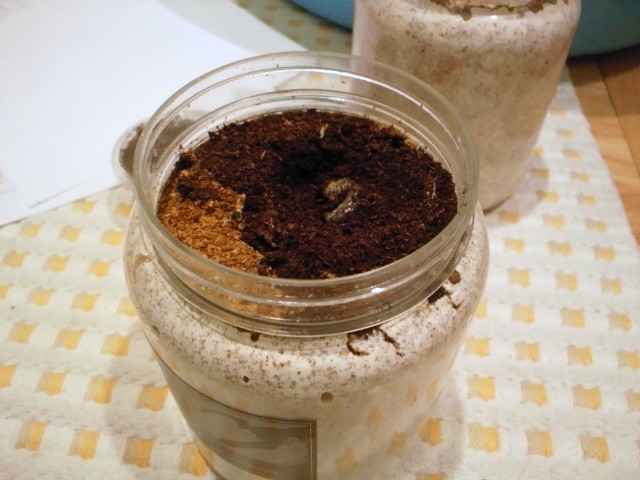 そしてプリンカップマット投入からおよそ1ヶ月経過する頃にダメもとでカップのマットごと今度は2ヶ月くらい寝かせた菌糸ボトルに投入したんです。