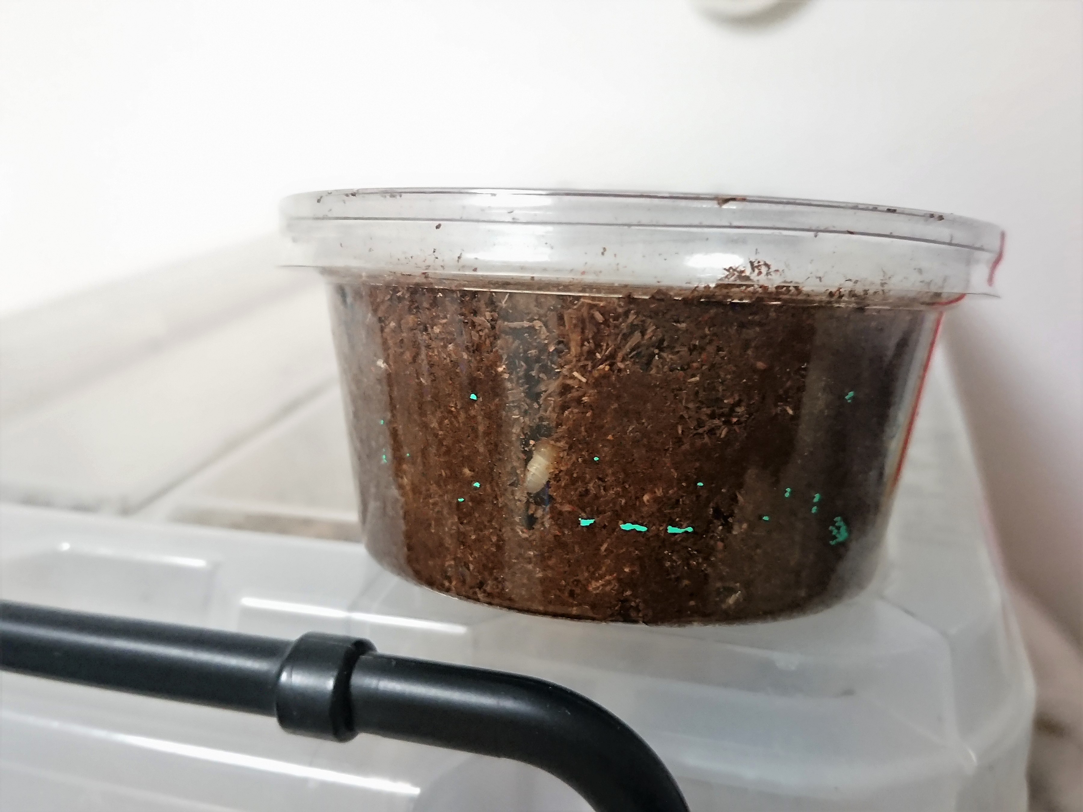 なにげにそれらのカップを見ると、幼虫の姿が見えていたので期待を持ちながらマット交換することにしました。
