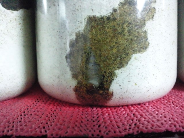 若齢状態で投入したカズミアエ幼虫がボトルの外側から確認できたので写真を撮りました。頭の幅が大きくなっていることを確認できます♪