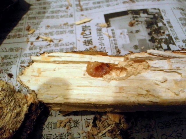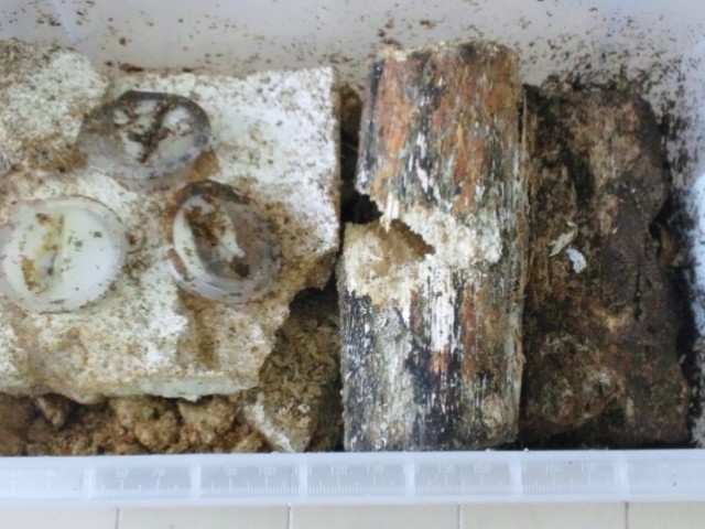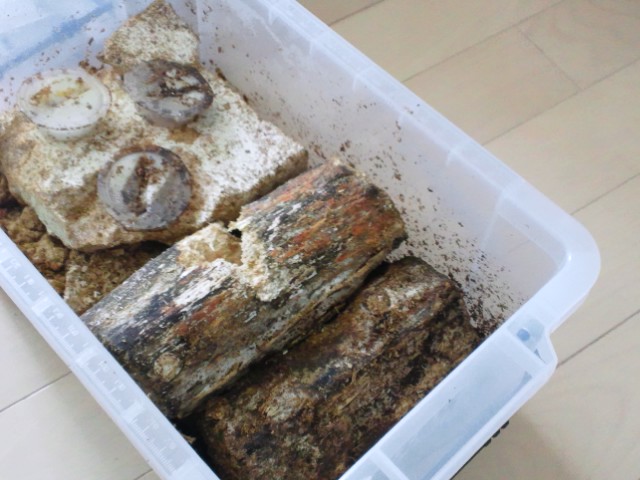 菌床のほうはだいぶ崩されてきてるようです・・中央にあるのはナラのカワラ材で右側にあるのがクヌギのカワラ材です。2本とも自作で用意したカワラ材です。