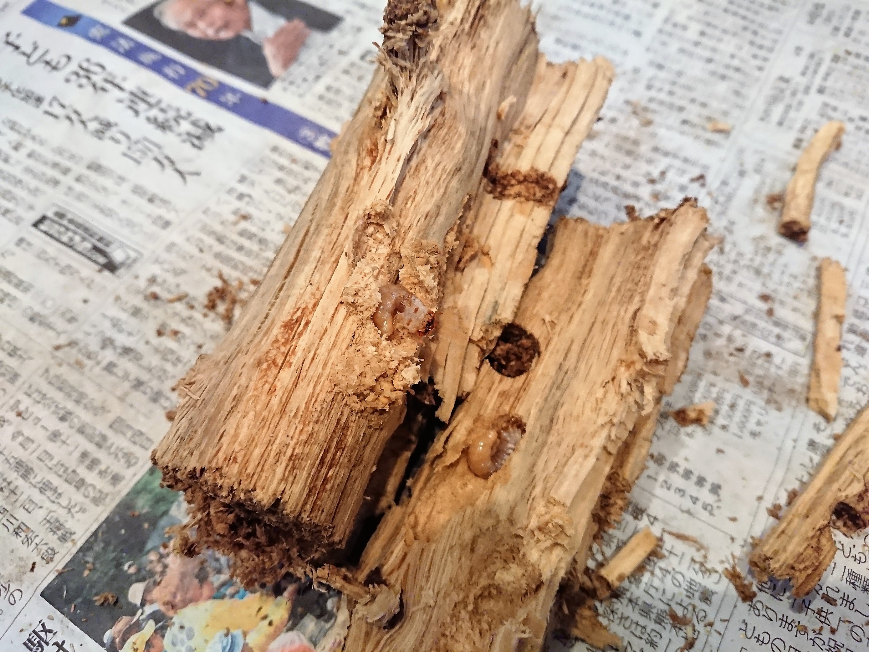 まぁ、ダメもとでそこにある材を割ってみることに。一応は産卵痕はあったりしたので。