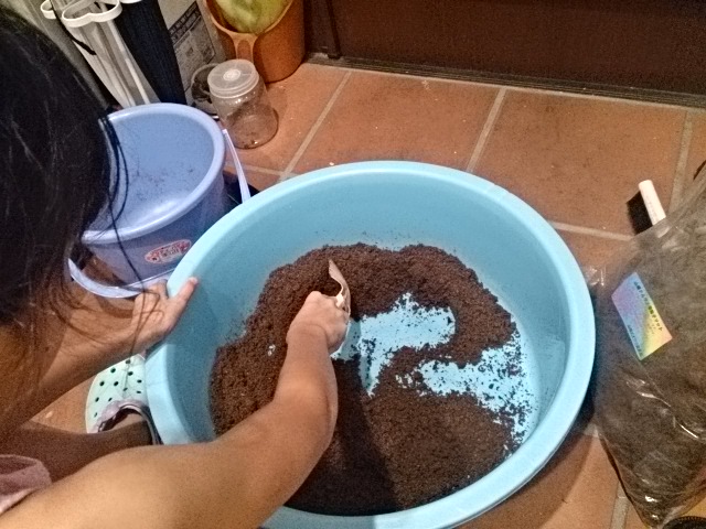 フタマタクワガタやシカクワガタに使うクワガタマットを加水作業しようと思って早めに所要を済ませてひっそりやろうと思っていましたが、久々に長女が割り込んできました。