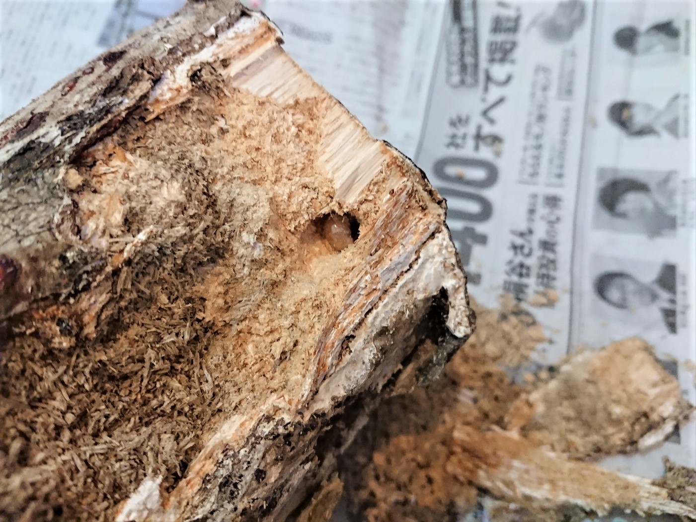 すんなり穿孔したから安心しておりました。ある時に見たらメスが材から出ていてエサを食っていましたが、そのまま放置しておいたのです。