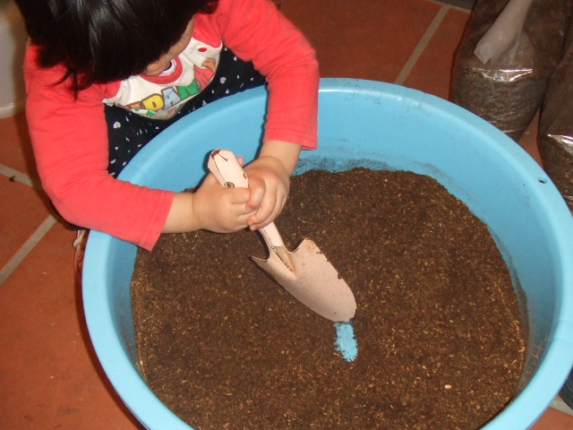 クワガタの飼育に使うために数種類のマットを混ぜ混ぜしてもらいました。