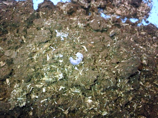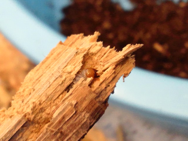 ↓ 材をどかして一応、敷かれてるマットをかき混ぜてみたら初令幼虫が出てきましたよ~!