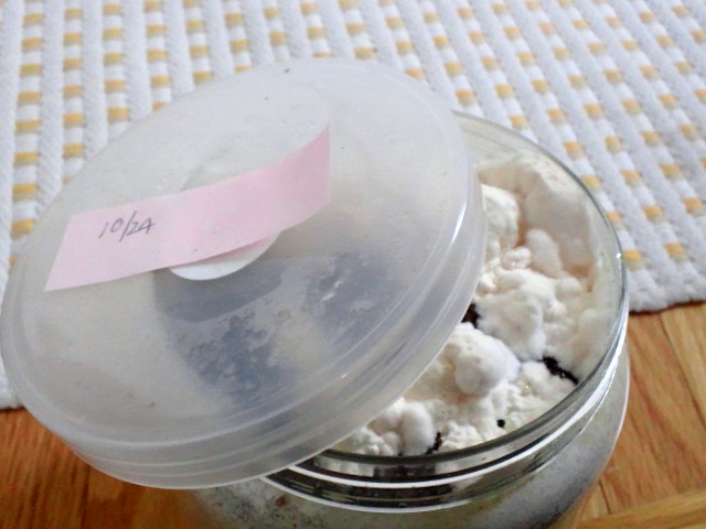 ↓ 10月に手詰めしたボトルです。表面はだいぶ白く盛り上がってきてます。これはカワラ菌です。