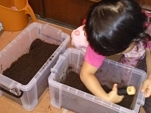 まずはマットの加水作業から。加水して撹拌させます。こういった作業は子供にとって遊び半分で楽しそうですね^^