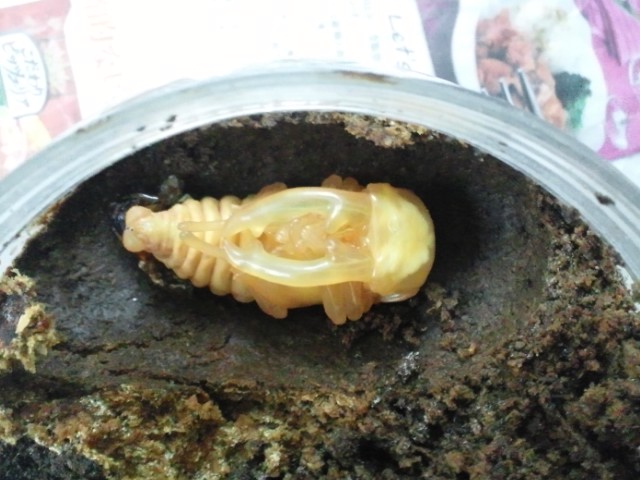 これまただいぶ劣化してる状態の菌糸ボトルで蛹室を作成しちゃったもので、まずはちゃんと蛹になることを確認して、さらには少し落ち着いた頃を見計らって劣化部分を掘り出そうと予定しておりました。