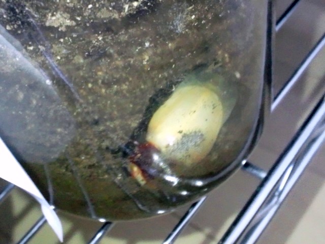 ↓ まだまだ羽が白いです(^_^;) 幼虫の時にボトル壁を傷つけた跡がみえます。