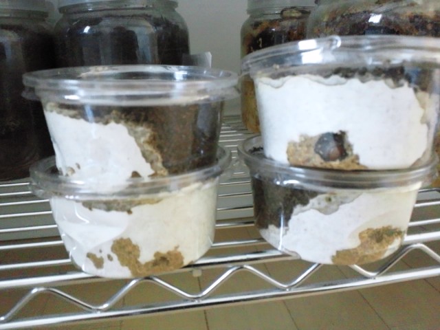 以前の記事にもupしてみた内容なのですが、プリンカップにマットとカワラ菌を半分ずつ詰めたのがあって、それにボーリンの初令を投入していた個体達がいます。