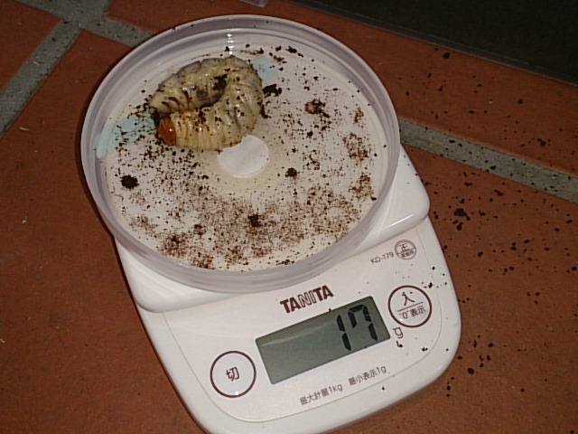現時点で3令幼虫が1頭だけ残っています。同腹の幼虫たちはすでに成虫になり、現在のブリードに活躍していたり他の飼育者さんのところへ旅立ったりとしてるのに、こいつだけいまだに幼虫・・・