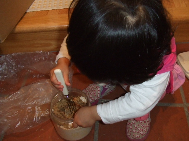 ↓ とりあえず幼虫を突っ込む穴あけをば^^