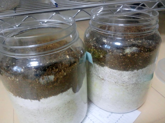 さて、手詰めして保管していたカワラ菌床も落ち着いてくる頃なのでまだマットで管理していたボーリンの2令を投入することにしました。。