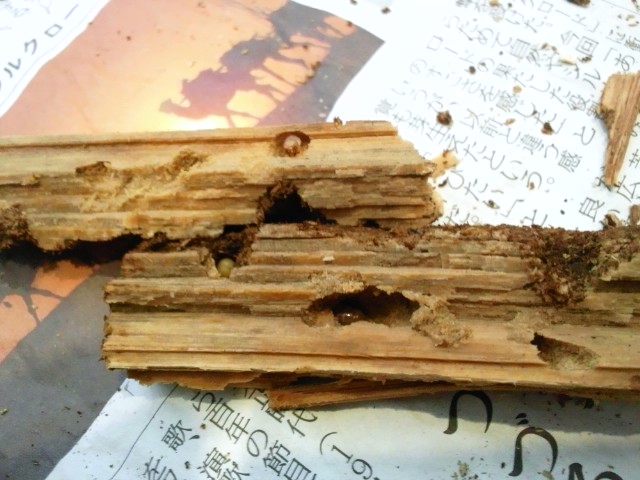 ↓ こぉんな幼虫が出てきました。このかけらからは見づらいかもですが、幼虫と卵がみえます。