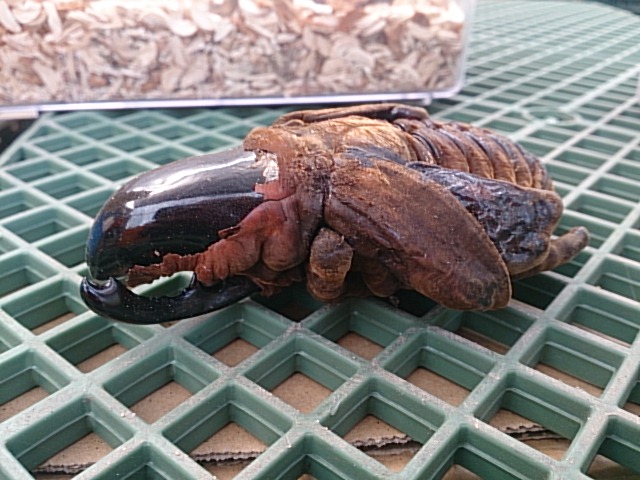 ちょうど羽化して間もなかったようで、胸角に殻をつけて上翅がまだやっと色がついてきた程度の状態でした。