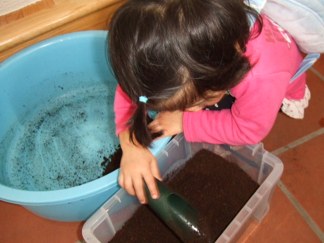 大きめの容器にマットを入れる作業はお決まりパターンで二女がやりたがってきたので好きなだけやらせました~