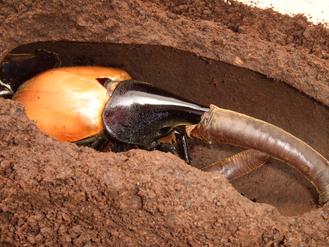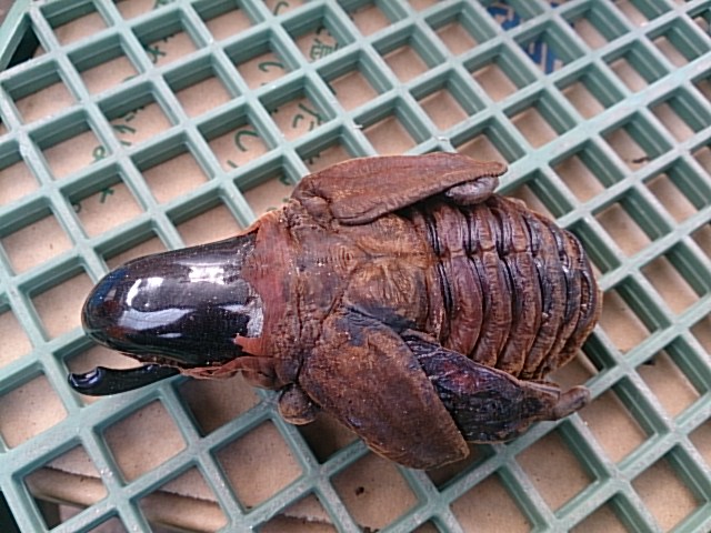 ちょうど羽化して間もなかったようで、胸角に殻をつけて上翅がまだやっと色がついてきた程度の状態でした。
