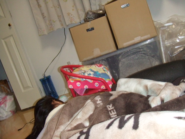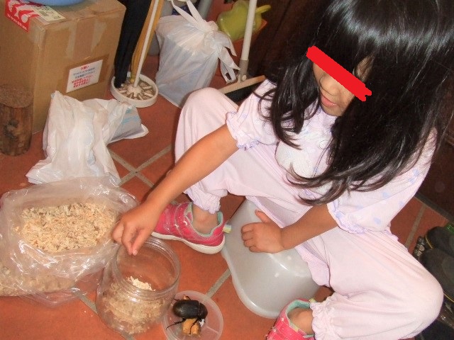 そしてまた例年通りに暑い夜なので、二女はいつのまにかクワカブ部屋にて寝ちゃいます。