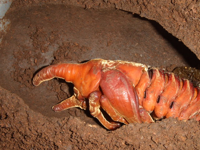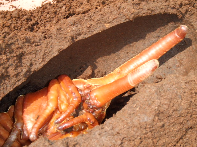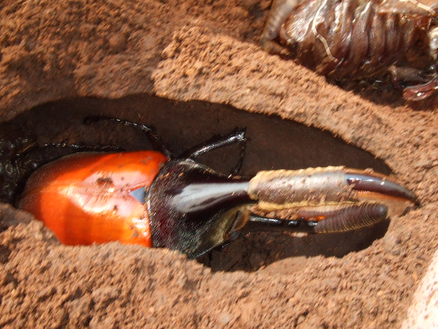 そして、ゆっくり掘っていってみたら羽化したばかりで羽がまだ赤かった成虫もいました。