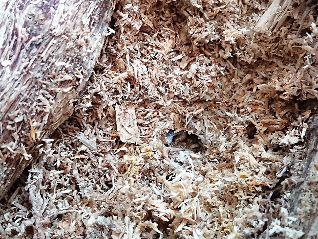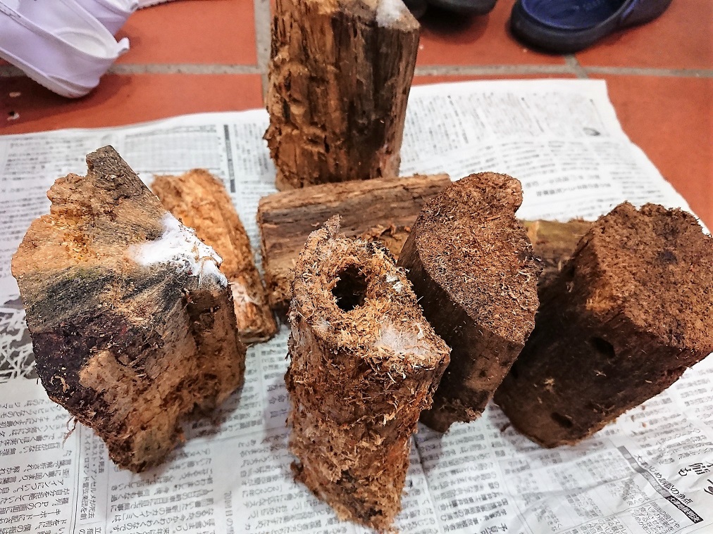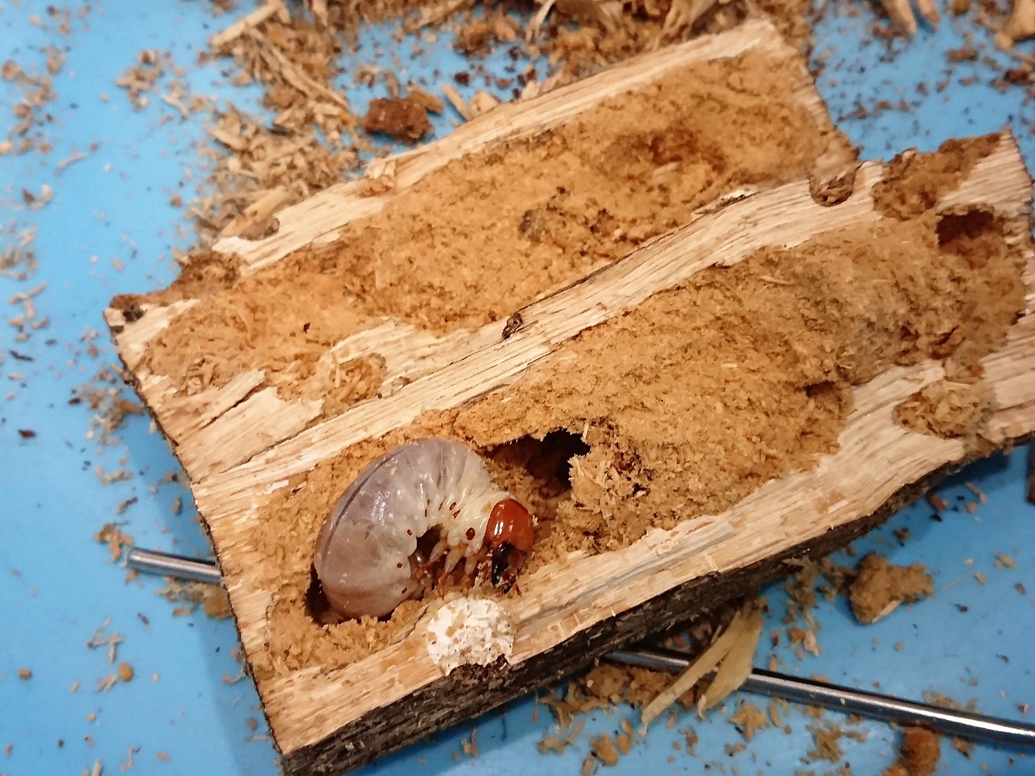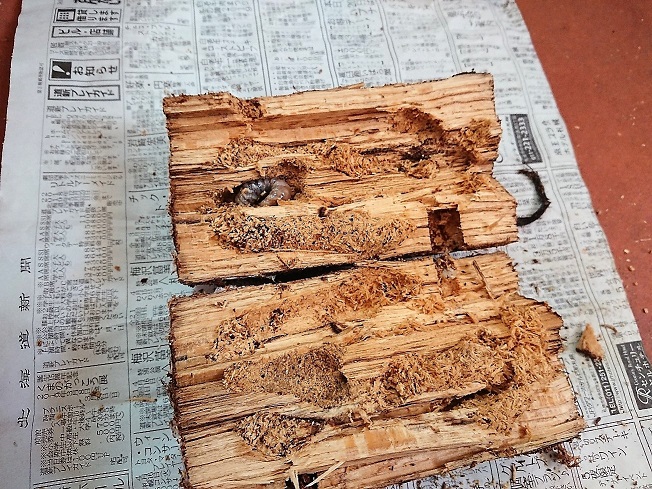 大きい穴がある材がありました。これは成長してる幼虫がいることでしょう。