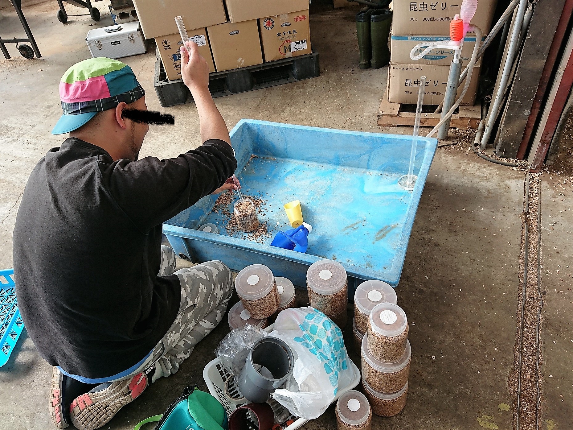 ↓ とある飼育者さんが私と同じように現場で菌糸詰め作業やマットの加水作業を。。