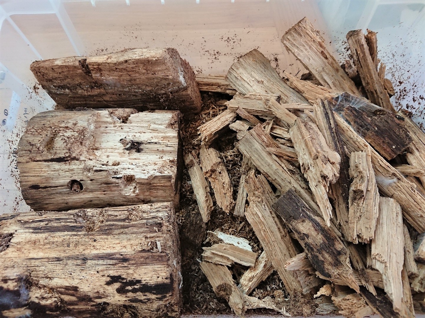 さて、残ってる材にはどのくらいの幼虫がいるのか、はたまたもうボーズ状態なのか・・・