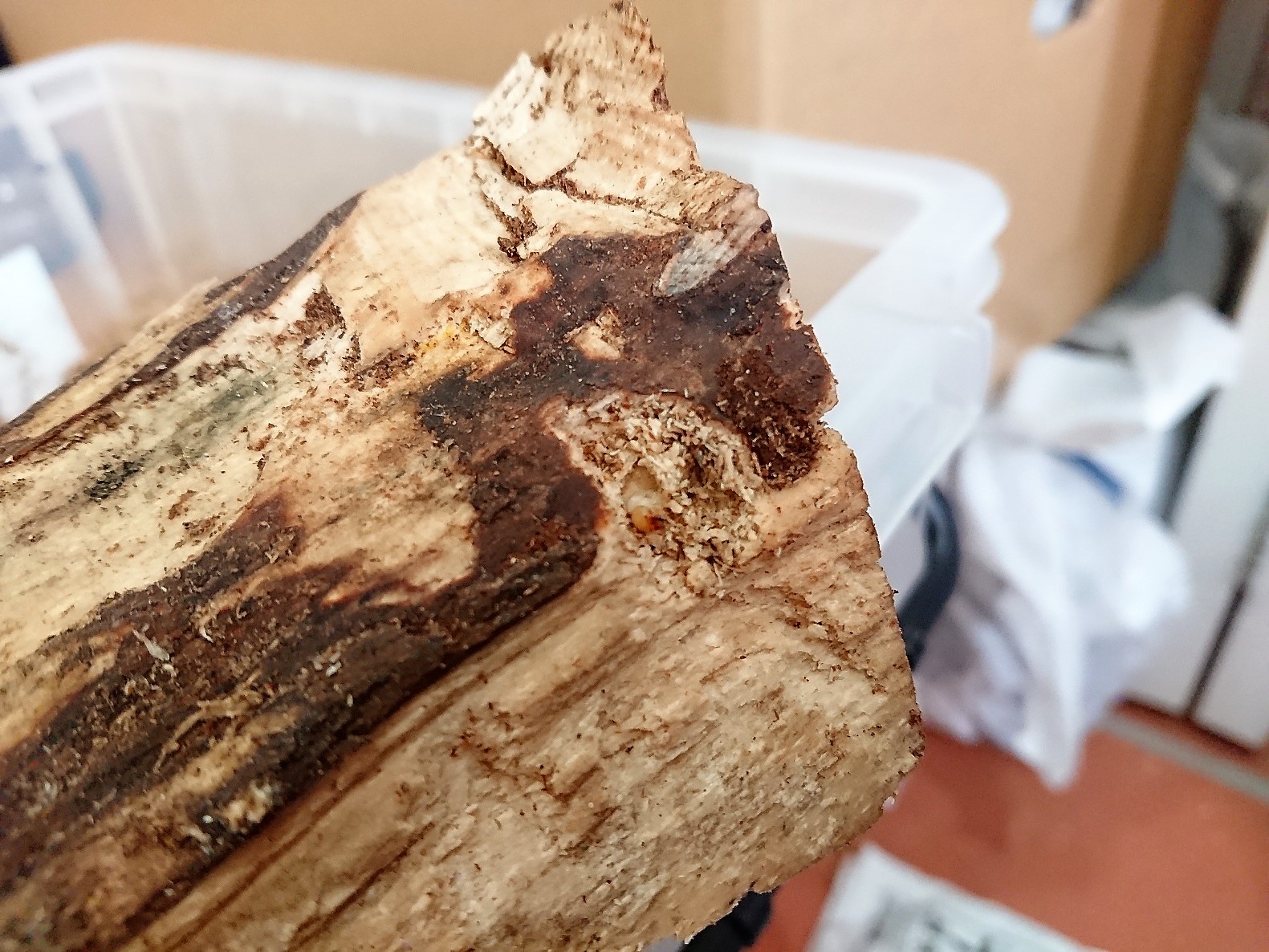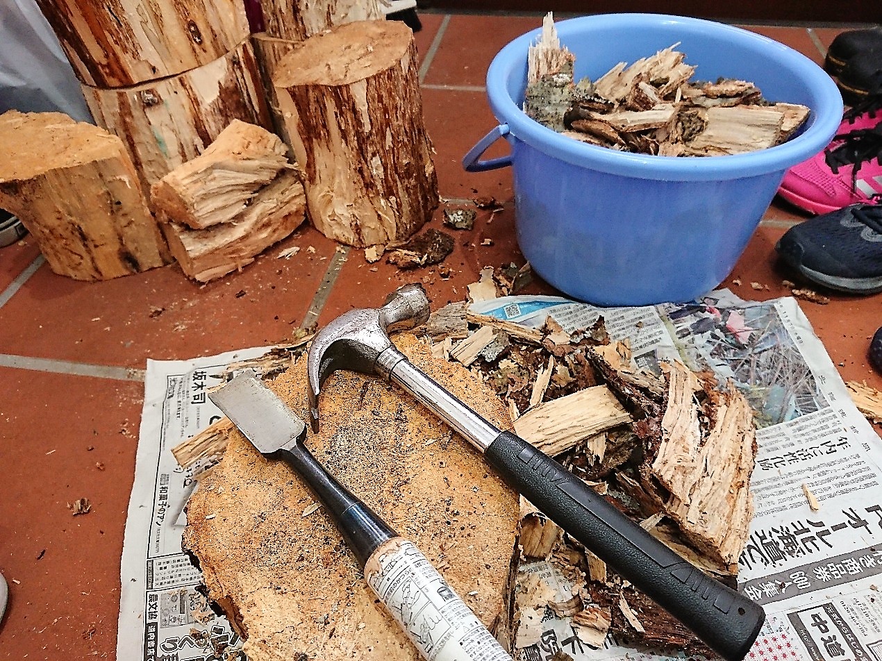 とりあえずは気になる材をていねいに割ってみると、いました!