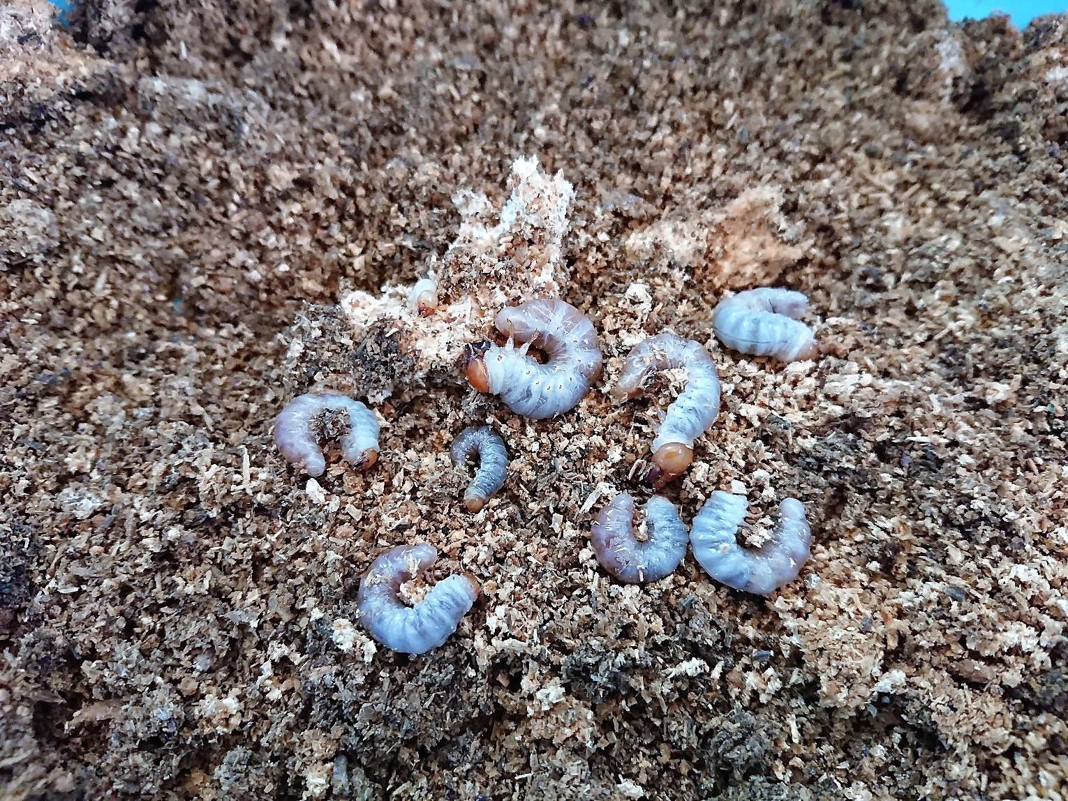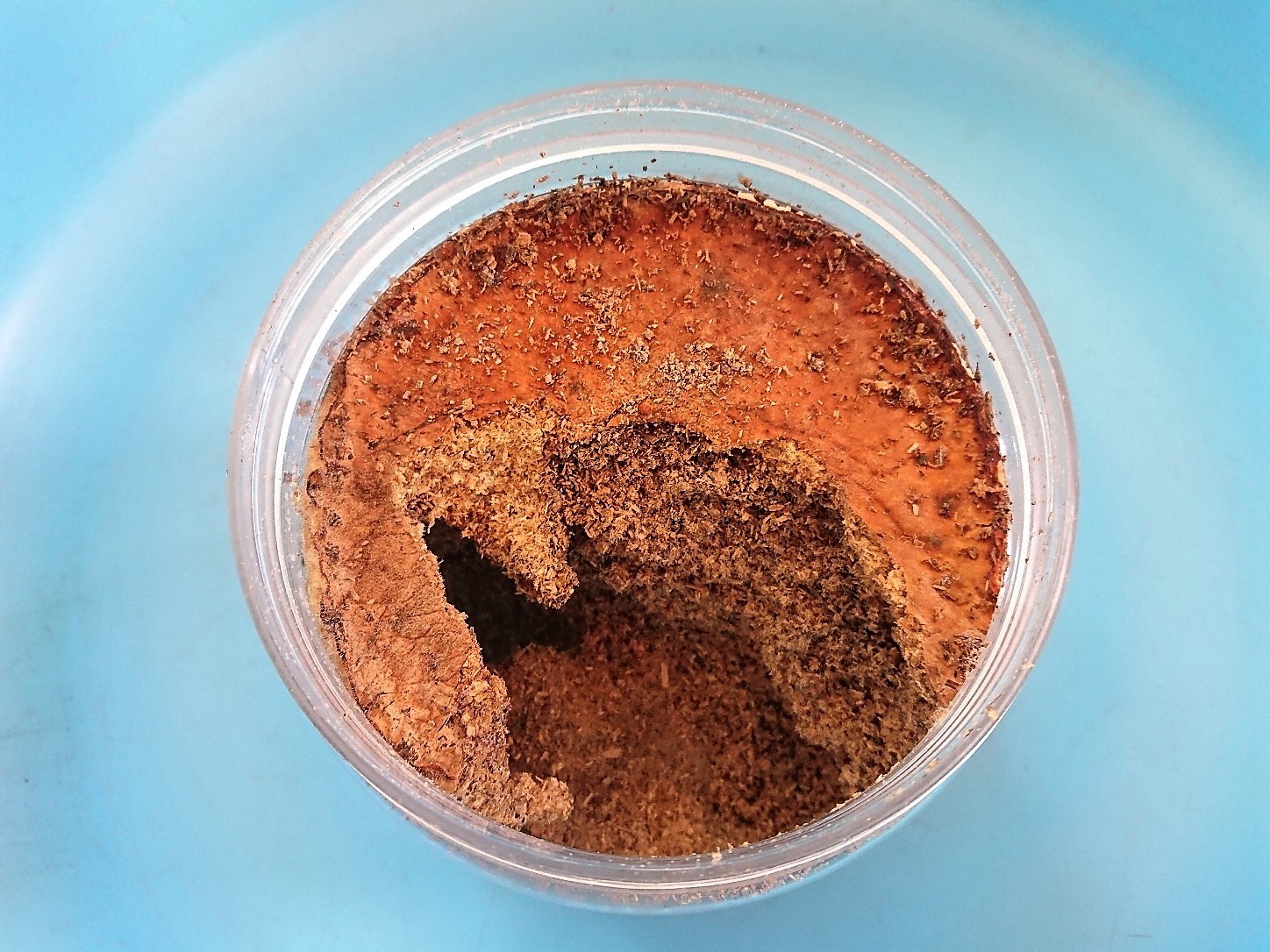 去年に羽化してる個体群が蛹室を崩して掘り進んでいたり、表面に出てきてたりと見えたので、成虫用のマットに取り替える作業をしました。
