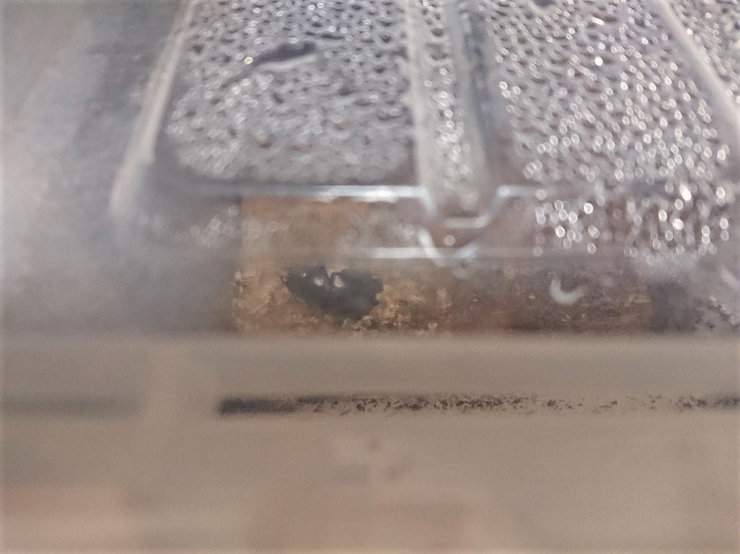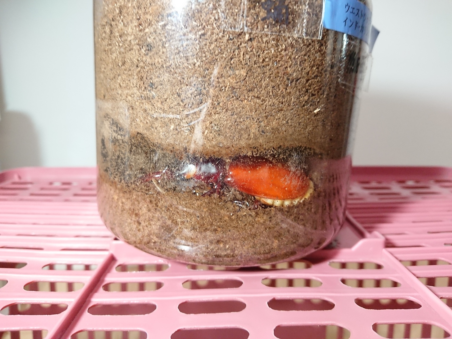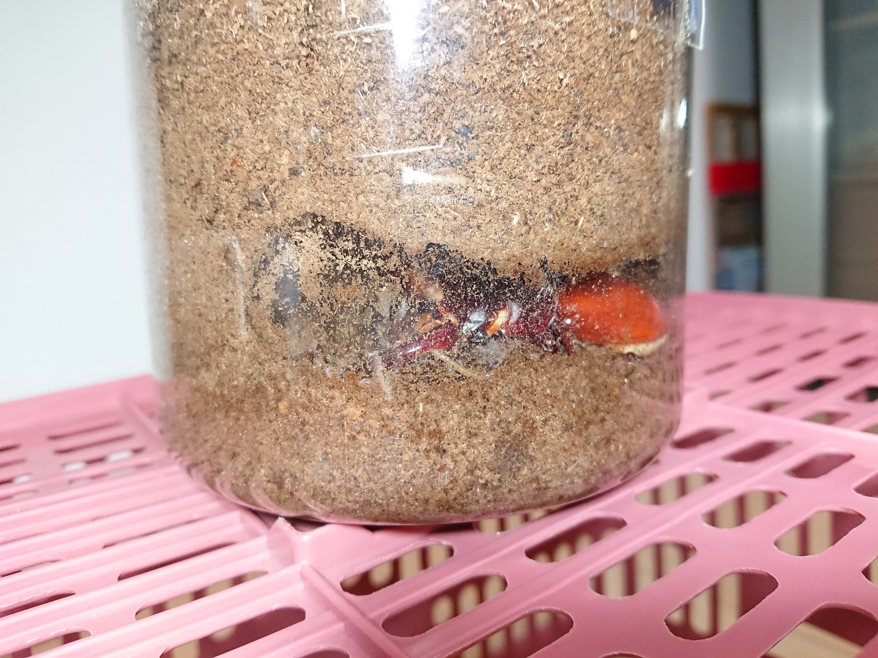 せっかくなので、このおチビな成虫を同居させてみたら交尾したようなので、産卵セットに投入してみました。