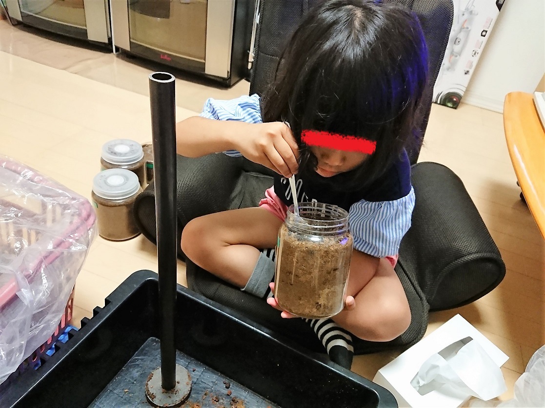 こっそりとボーリンフタマタの幼虫がいるボトルの交換作業しようとしたら、二女に見つかってしまっていつものように割り込まれてしまいました。