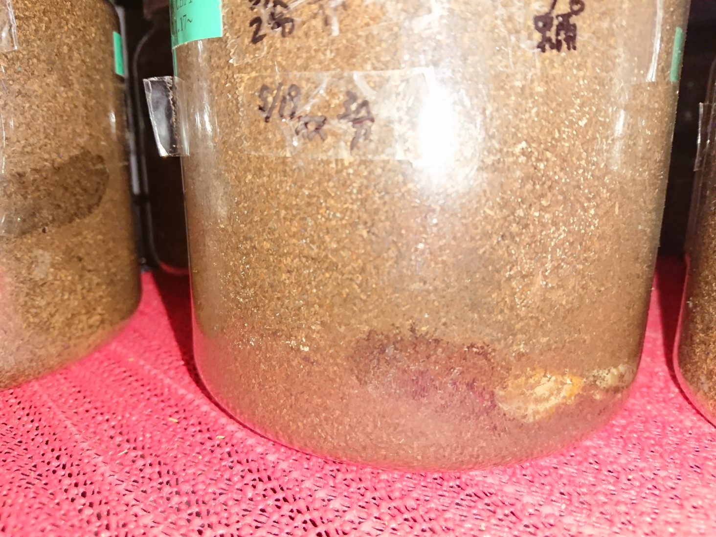 ↓ まずはFE菌糸のやつ、だいぶオガの部分が黒くなっています。